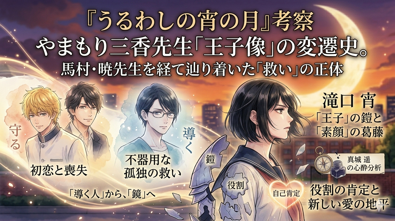 あの日、『ひるなかの流星』で馬村や獅子尾という「選ぶ恋」に身を焦がし、『椿町ロンリープラネット』で暁先生という「不器用な孤独」に寄り添った私たち。やまもり三香先生が描いてきた物語の軌跡は、常に私たちの心の最も柔らかく、時に痛みさえ伴う場所に、優しく、けれど確かな色彩を差し込んできました。そして今、最新作『うるわしの宵の月』という一つの到達点で、先生は「王子という役割(よろい)さえも肯定し、ありのままの自分を愛する」という、これまでの少女マンガの常識を覆す究極の救いを提示してくれたのです。