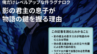 アニメ 成長ヒストリー 俺だけレベルアップな件 ラグナロク解説|影の君主の息子・護の正体とは? 『俺だけレベルアップな件 ラグナロク』は、本編完結後を描いた続編として大きな注目を集めています。主人公は水篠旬の息子・水篠護であり、影の君主の血を引く存在です。この記事では、ラグナロクにおける影の君主の息子・護の正体や力、そして物語の核心に... 2025.09.28 アニメ 成長ヒストリー